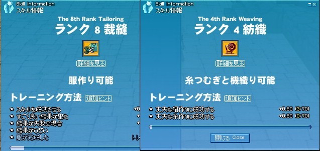 紡織と裁縫がとりあえずの目標には到達しましたね、紡織は4だけ無理くり上げれば3から1まで暇な時雑貨店バイトをやっていればいつの間にか1になっているという素晴らしい感じです。裁縫は、まぁ暇な時に7までですかアルバイトのお世話になるので適当にやっていればいつの間にかランク7になっているようですが、その上が地獄の始まりのようですね。紡織のランク8がFランクの修練に見えるぐらいの地獄が待っているようですな。