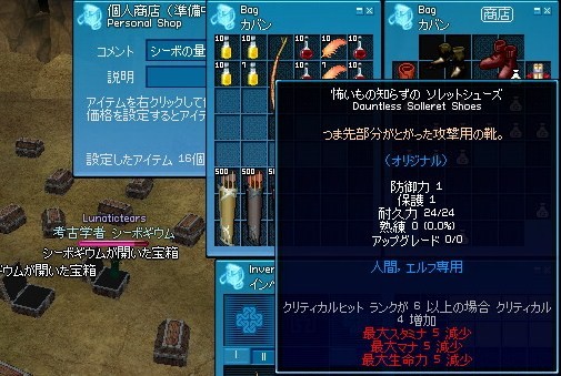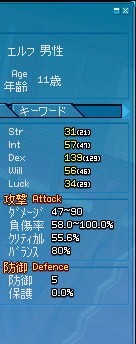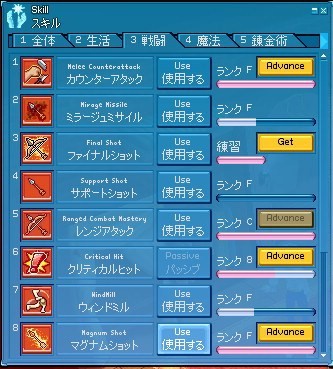そして今週はとうとう製錬のスタートです。転生時のDEXが77製錬を2まで上げたとして+26なので103が基準でDEX低下装備がトータル-84のを用意してあるからタイトルと足して114までならDEXを上げていいってことになりますね。まぁようはレベル上げは一切しないで手持ちのAP20を上手く使い製錬のみを集中的に上げればおkって所ですか、、製錬が終われば次は戦闘スキルの強化に走れるわけで次はレンジ9にしてクリティカルマスターを目指すのかな、、、